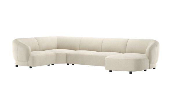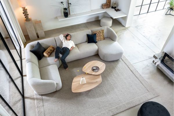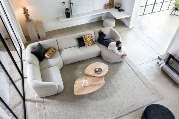 Ben je op zoek naar een royale hoekbank om ontspannen in te loungen? Deze modulaire sofa CERVO bestaat uit een 1-zits met arm links, een hoekelement, een 2,5-zits zonder armen en een longchair met arm rechts. De ronde hoeken, vloeiende lijnen en schuin uitlopende armleuningen geven de sofa een zachte, moderne look. Doordat de elementen rondom gestoffeerd zijn, kun je ze op verschillende manieren met elkaar combineren of vrij in de ruimte plaatsen. De bekleding in stof Cloudy beige geeft deze opstelling een rustige uistraling.