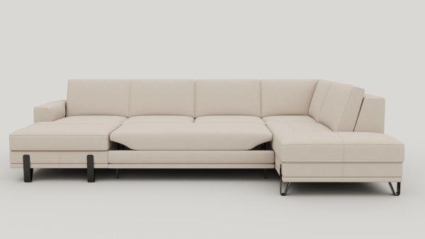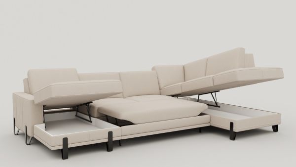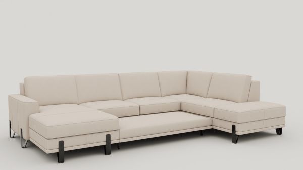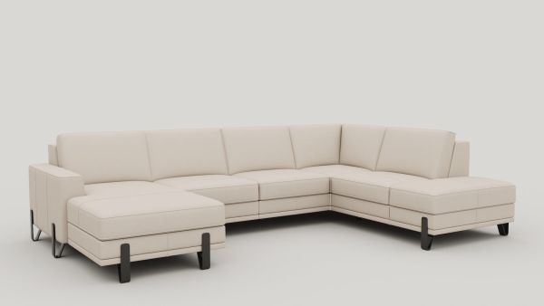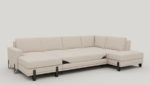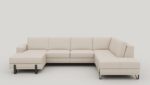 Deze grote U-opstelling van bank DENVER biedt veel zitruimte en praktisch comfort. De longchair links en grote ottomane rechts hebben opbergboxen, handig om spullen netjes uit het zicht te houden. De pocketvering zorgt voor prettig zitcomfort. De bank is uitgevoerd in de zachte chenillestof Livigno crème en staat op een stoere designpoot van 13 cm. Zo krijgt de opstelling een rustige, minimalistische uitstraling.