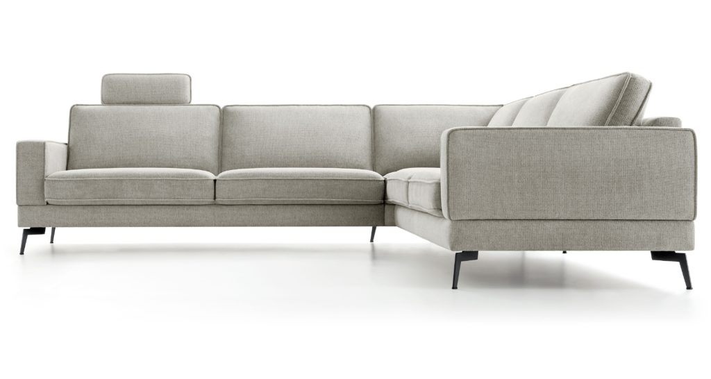 Gepresenteerd in actuele stof mito met luxe verstelbare hoofdsteun. Stijlvol en comfortabel uitgevoerd met het standaard zitcomfort. Zoals getoond: 3-zitsbank arm links + hoekelement + 2,5-zitsbank arm rechts in stof mito, kleur: desert. Met zwarte metalen poten, in standaard comfort uitvoering met de optionele hoofdsteun. Afmetingen: H84 x B295 x D275/97 cm.