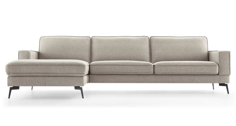 Gepresenteerd in actuele stof solution. Het memoryfoam in de zitkussens zorgt voor een relaxed zitcomfort dat zich volledig aansluit bij je zitvorm. Zoals getoond: Longchair links + 3-zitsbank arm rechts in stof solution, kleur: light brown. Met zwarte metalen poten en de optie memoryfoam in de zit. Afmetingen: H84 x B277 x D177cm.