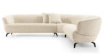 Deze hoekbank straalt verfijning uit dankzij de elegante rondingen die rug en armen sierlijk met elkaar verbinden. De lichte bekleding met fijne textuur versterkt de rustige, moderne vormgeving en geeft het ontwerp een luxe uitstraling. De slanke zwart metalen pootjes zorgen voor een luchtige en elegante balans.