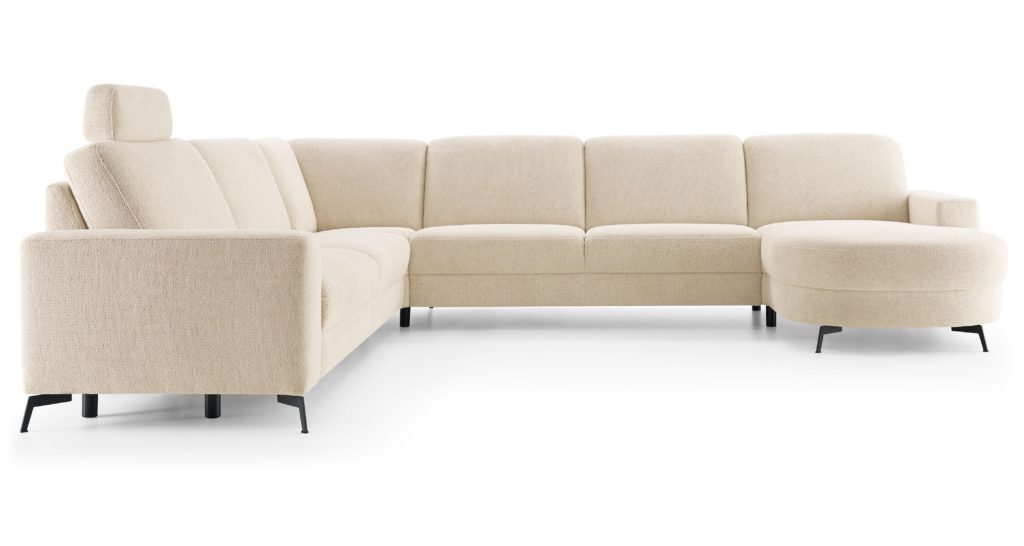 Deze hoekbank combineert een rustige vormgeving met een eigentijdse, ronde hoek die direct in het oog springt. Bekleed in de stof Tori in de kleur ecru brengt hij een frisse en lichte sfeer in huis. De zwarte metalen poten van 12 cm hoog zorgen voor een moderne afwerking. De hoofdsteun is optioneel verkrijgbaar. Afmetingen: H88 × B355 × D95/295 cm.