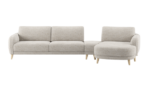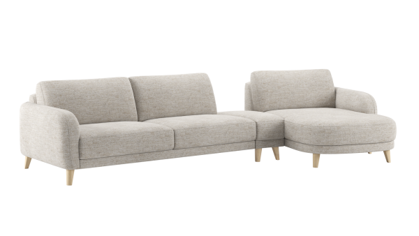 Deze MANCIANO-opstelling combineert een 3-zits met arm links, een triangel poefelement van 25 x 60 cm en een longchair van 170 cm met arm rechts. Dankzij het triangel-element zonder rug ontstaat een speelse overgang in de opstelling, met een subtiel doorkijkje dat de bank een luchtige uitstraling geeft. De zachte, minimalistische vormen geven MANCIANO een eigentijdse look. De poten van massief eikenhout vormen samen met stof Luton beige een warme combinatie met een Scandinavische uitstraling.