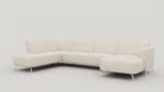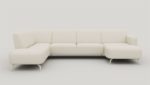 Deze TWIST-opstelling straalt warmte en elegantie uit. De combinatie van een longchair (chaise longue) links, een 2,5-zits zonder armen en een ottomane (ligelement) rechts vormt een ruime, comfortabele U-opstelling. De bank is bekleed in boucléstof Brioni in de kleur lever en rust op metalen designpoten in de trendy kleur silk grey. Met zijn afgeronde lijnen en zachte zit door de standaard pocketvering, past hij perfect in een modern interieur. Deze opstelling is ook leverbaar in crème, ivory en kiezel.