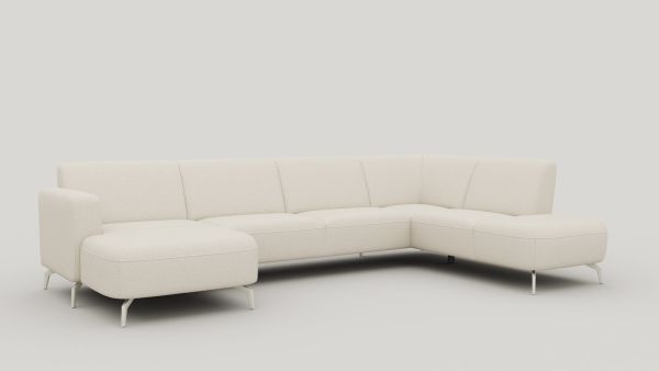 Houd je van rust en comfort in huis? Dan is deze TWIST-opstelling een perfecte keuze. De longchair (chaise longue) links, 2,5-zits zonder armen en ottomane (ligelement) rechts vormen samen een royale U-vormige bank met een zachte en luchtige uitstraling. De bank is bekleed met boucléstof Brioni in de kleur ivory en afgewerkt met een metalen poot in silk grey. Dankzij de pocketvering zit je extra comfortabel. Deze opstelling is verkrijgbaar in e kleur ivory, maar ook in crème, kiezel en lever.