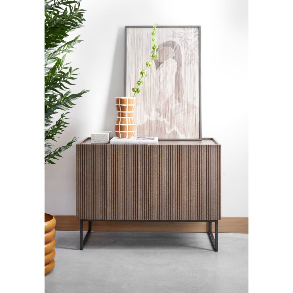 Dressoir Marandi small is onderdeel van een stoer en tijdloos woonprogramma. Dit dressoir is uitgevoerd in bruin eiken fineer en voorzien van 2 deuren met een push-to-open en soft-close systeem. De zwart metalen poten in combinatie met de mooie geribbelde structuur geven model Marandi een licht industriële look.