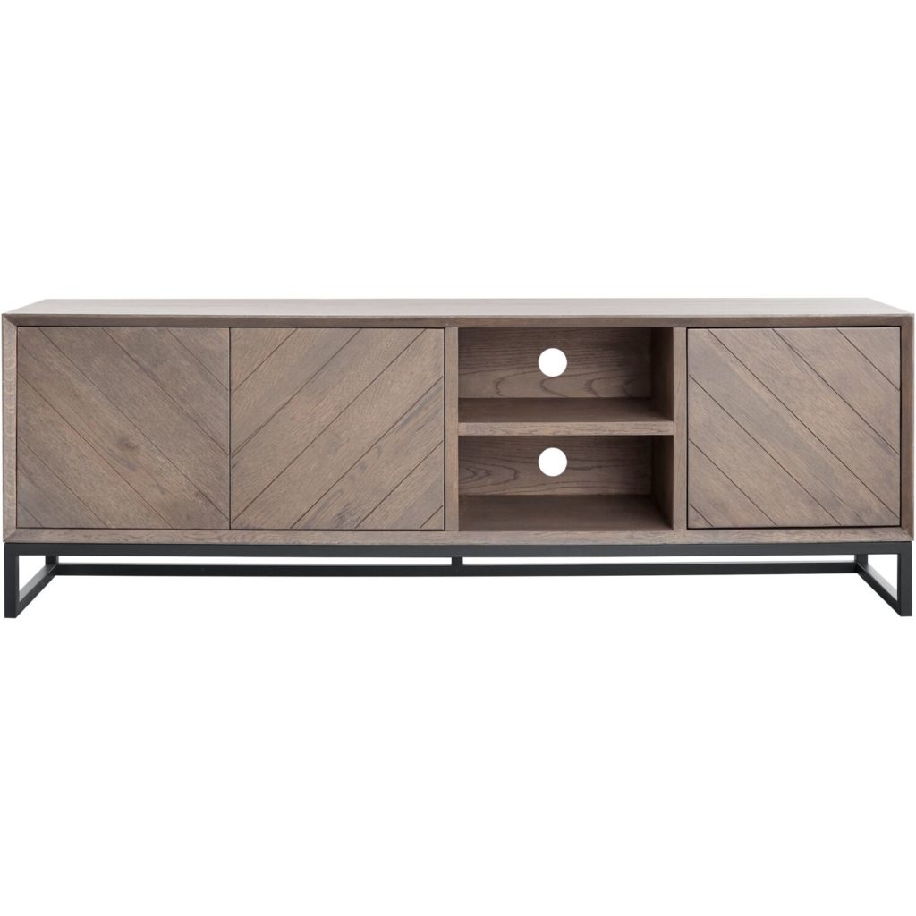 Je kunt kiezen uit verschillende kleuren. Dit TV-Meubel heeft drie deuren en twee open vakken en is uitgevoerd met een laklaag in de kleur Slate.