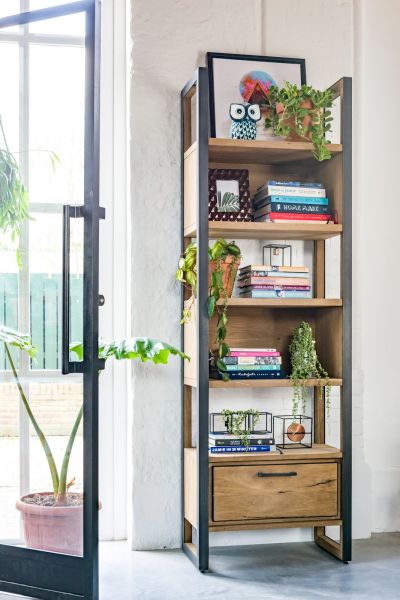 De moderne stoere boekenkast uit de Metalo collectie van Henders & Hazel heeft een opvallend design. De boekenkast heeft zowel open als dichte niches en een handige lade om spulletjes in op te bergen. Opvallend zijn de metalen poten die doorlopen langs de zijkant van de kast. De perfecte boekenkast voor de liefhebbers van een eigentijds interieur.