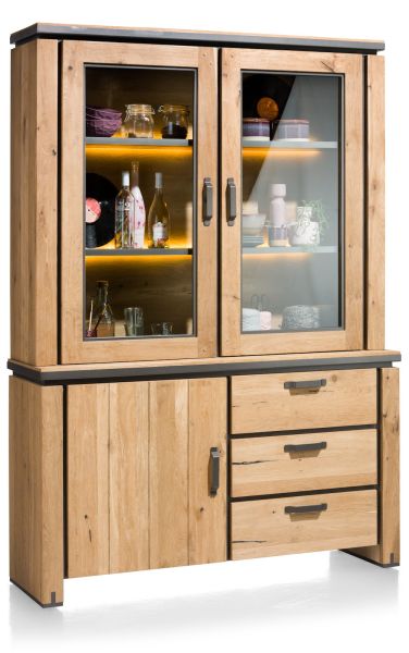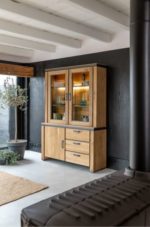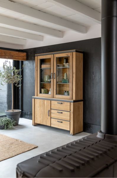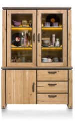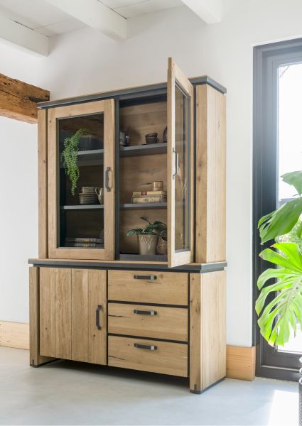 De traditionele buffetkast in een moderne jasje. Dat is de houten buffetkast uit de Farmland collectie van Henders & Hazel. De kast is gemaakt van eikenhout en eikenfineer. Opvallend zijn de metalen accenten die de buffetkast een stoere uitstraling geven. De buffetkast heeft 2 vitrinedeuren, 1 dichte deur en 3 laden. Achter de vitrinedeuren schijnt een warm led licht. Mooi en praktisch.
