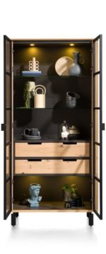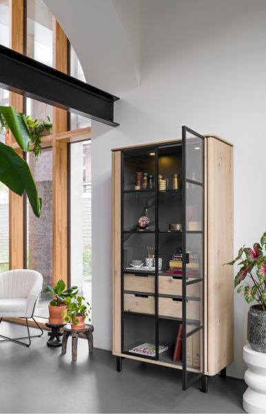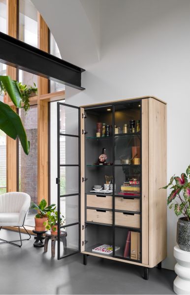 Vitrinekasten zijn fraaie sfeermakers en absolute blikvangers in het interieur. Deze moderne vitrinekast uit de Livada collectie is daar een goed voorbeeld van. De vitrinekast is gemaakt van wild eiken fineer en afgewerkt in de kleur Natural. De binnenkant van de kast heeft een mooie antracietkleur. Heel fijn is de geïntegreerde ledverlichting. Praktisch zijn de lades in de vitrinekast, er zijn altijd spulletjes die je juist niet in het zicht wilt bewaren. De vitrinekast is 100 cm breed, 200 cm hoog en is in 4 kleuren leverbaar.