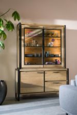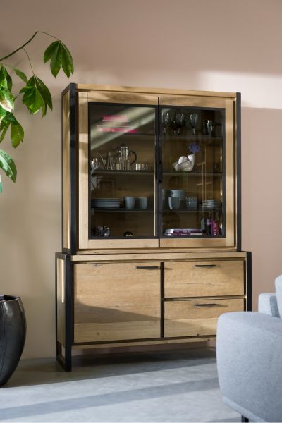 Hoe tof is deze moderne buffetkast met rustieke uitstraling uit de Metalo-collectie. De buffetkast, gemaakt van eikenfineer, heeft een eigentijds design. Het eikenfineer is vrijwel niet van massief hout te onderscheiden en afgwerkt in de kleur railway brown. Stoer zijn de metalen accenten in de kleur desert black. De buffetkast heeft 2 glasdeuren, 1 deur en 2 laden. De ledverlichting achter de glasdeuren zet fraai servies of woondecoraties in de spotlight.