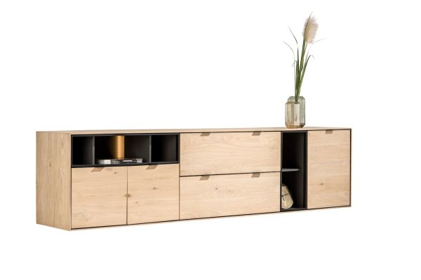 Met onze nieuwe serie ELEMENTS haal je de interieurstylist in je naar boven! Je stelt namelijk met alle losse ELEMENTS items jouw (wand)kast helemaal naar eigen wens samen. Gebruik dit naturel eiken fineer dressoir van 240 cm breed inclusief 3 deuren, 2 laden en 5 met led verlichte niches als basis en combineer het met andere ELEMENTS items in bijvoorbeeld onyx, lak groen, of lak zwart. Ga je voor een XS opstelling of pak je groots uit en wordt het een XXL kast?