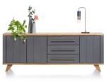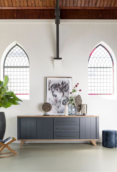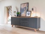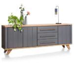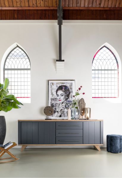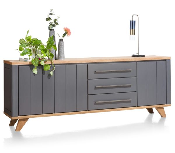 Dit dressoir uit de Jardin collectie van Henders & Hazel heeft een stoere landelijke uitstraling. Opvallend zijn de strakke lijnen van het dressoir, dat 230 cm breed is. Het meubel is gemaakt van eikenfineer in de kleur Railway Brown met zijkanten en fronten van MDF in de kleur antraciet. Een mooie warme kleurencombinatie. Dankzij de 3 deuren en 3 laden is er aan bergruimte geen gebrek bij dit royale dressoir.