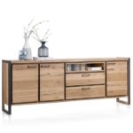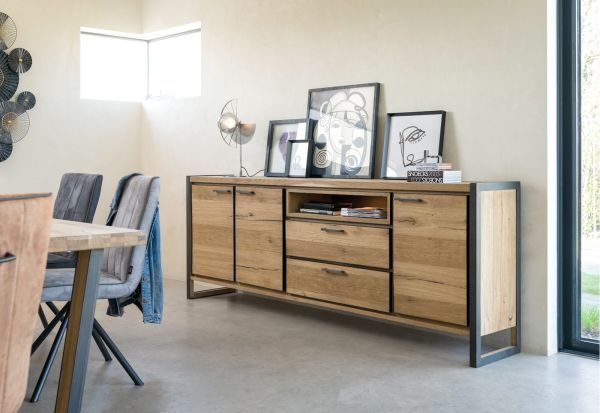 In de stoere collectie Metalo van Henders & Hazel zijn diverse dressoirs te vinden. Deze uitvoering heeft 3 deuren, 2 laden en 1 niche. Opvallend aan dit moderne dressoir zijn de metalen accenten, zowel in de poten die doorlopen als de frames rondom de deuren, laden en niche. Het dressoir is gemaakt van eikenhoutfineer en heeft een mooie natuurlijke tekening, die zo kenmerkend is voor eikenhout.