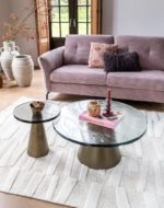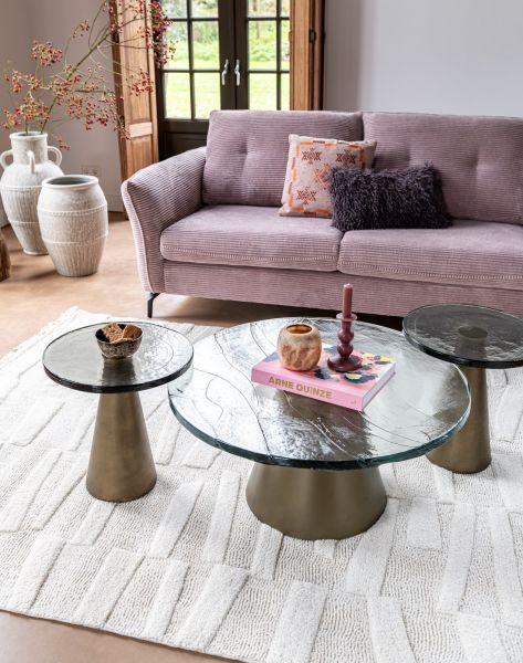 Salontafel Eloy heeft een uniek design met een goudkleurige metalen poot en een glazen tafelblad met ingewerkte reliëfstructuur. In deze salontafelserie zijn er twee verschillende modellen verkrijgbaar. Dit is het kleine model met een rond tafelblad van 41cm diameter. Deze versie is 43cm hoog.
