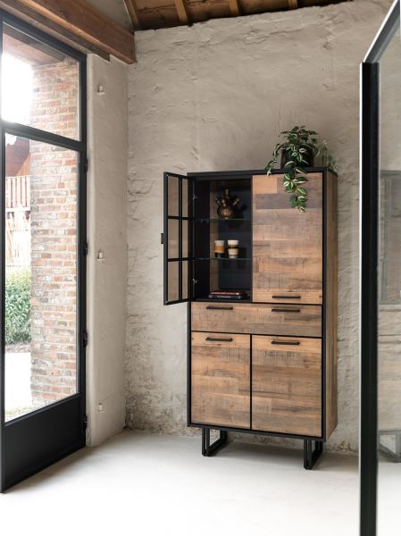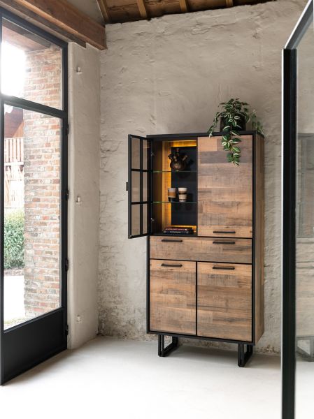 Hoe gaaf is deze bergkast uit de Avalon collectie? De kast heeft een stoere vintage uitstraling. Dankzij de 3 deuren, 1 lade en 1 glasdeur is er voldoende bergruimte. Opvallend is het geïntegreerde ledlicht achter de glasdeur. Deze bergkast is gemaakt van Primo Laminato, een sterk en onderhoudsvriendelijk materiaal dat vrijwel niet van echt hout te onderscheiden is. Het vintage uiterlijk dankt de kast aan de afwerking in de kleur driftwood.