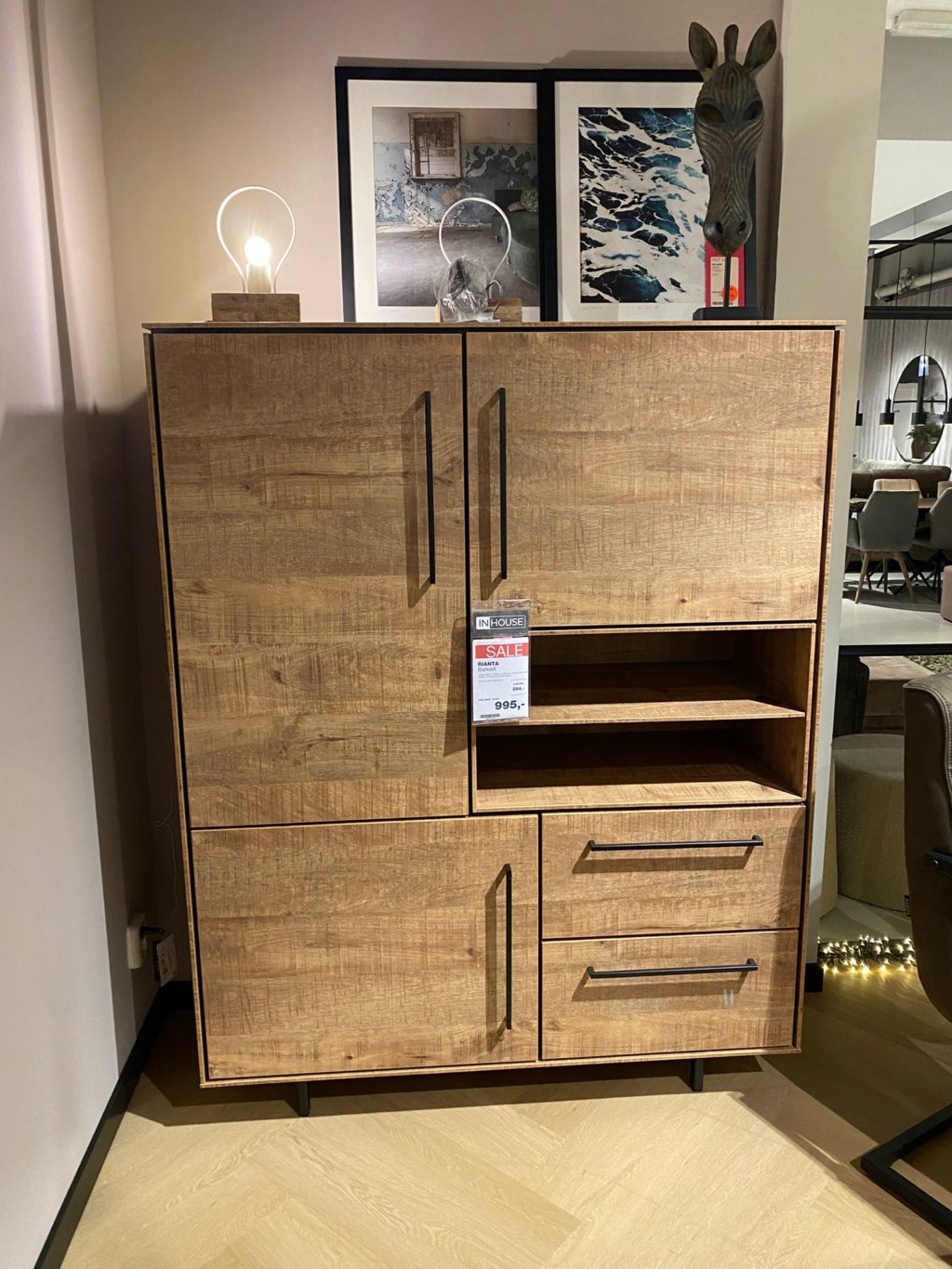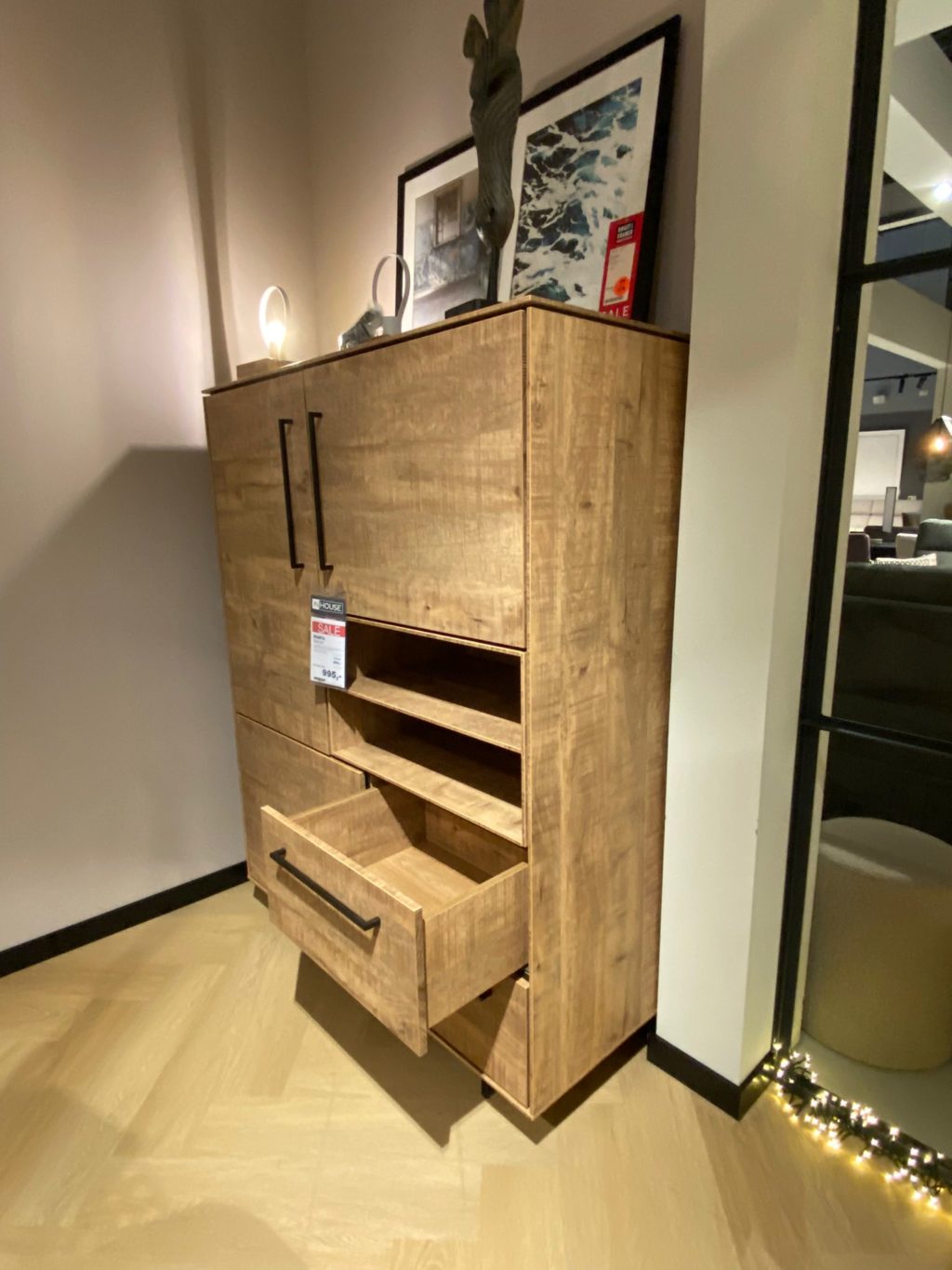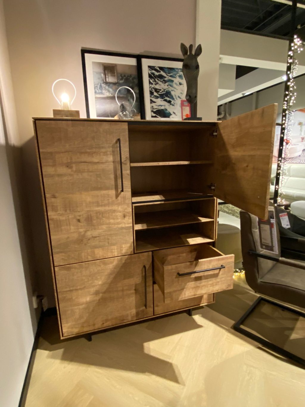 Met 3 deuren, 2 laden en 2 open vakken
