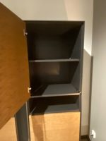 Uitgevoerd met korpus in MDF zwart structuurlak met 2 deuren (linksdraaiend) in eiken fineer