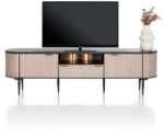 Een modern meubel, geïnspireerd op klassiek design; dat is dit lowboard ARAMON met zijn ronde vormen, marmerlook en stijlvolle lattenstructuur. Voor de ARAMON collectie hebben onze designers zich laten inspireren door vormen, materialen en kleuren uit het verleden. Het lowboard is 210 cm breed, staat op kegelvormige poten en heeft afgeronde zijpanelen die zachtheid aanbrengen in je interieur. ARAMON heeft 2 deuren, 1 lade en 1 niche dat met led is verlicht. Zie jij ‘m al staan in je woonkamer?