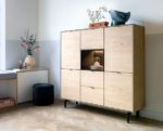 Dressette ELEMENTS is een veelzijdig meubelstuk dat zich ergens tussen een highboard en een dressoir bevindt. Het is een eigentijdse eyecatcher met een verfijnde uitstraling. De buitenkant straalt luxe uit met eikenfineer in de kleur naturel, terwijl de binnenkant is uitgevoerd in antraciet melamine. Dit dressette biedt volop opbergruimte met 5-deuren + 2-laden + 1-niche met sfeervolle ledverlichting. ELEMENTS heeft een breedte van 150 cm en is ook verkrijgbaar in de kleur onyx. De metalen poten geven hem een stoere finishing touch. Maak ook kennis met de andere kasten uit de ELEMENTS serie.