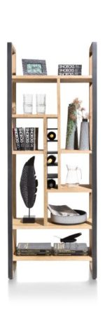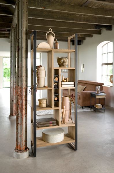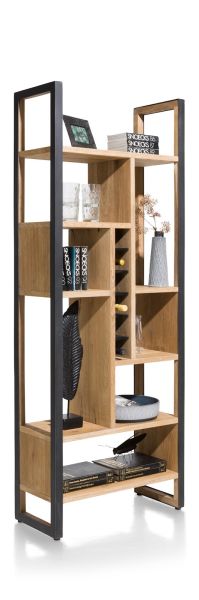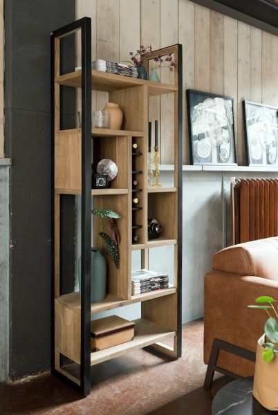 Deze stoere industriële roomdivider uit de Metalo collectie is op verschillende manieren toe te passen in het interieur. Strak tegen de muur, of juist om de ruimte in tweeën te verdelen. De roomdivider is gemaakt van eikenfineer in combinatie met metaal. Hij is 75 cm breed, 200 cm hoog en bestaat uit 8 niches en heeft 6 vakken waar wijnflessen in passen.