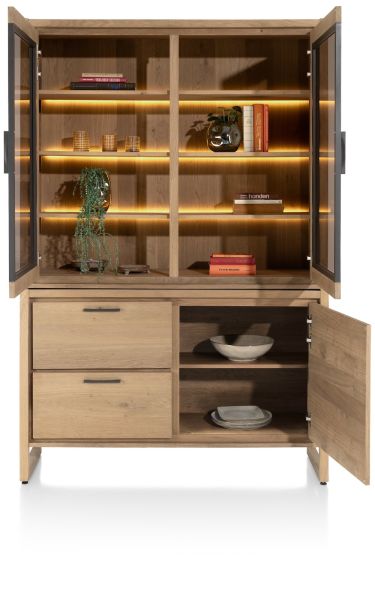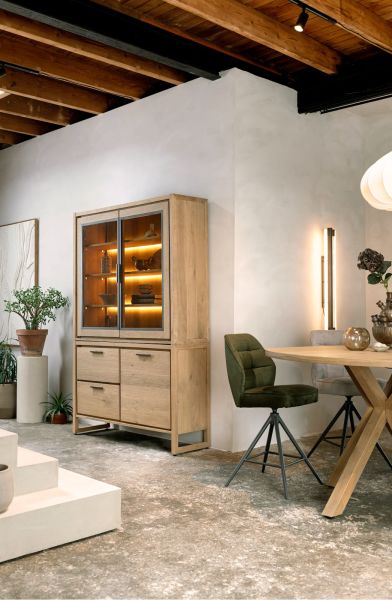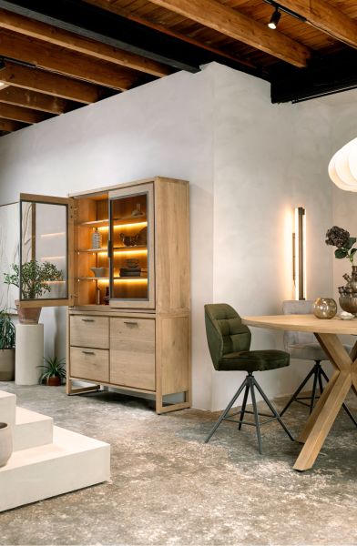 Droom je van een moderne buffetkast die warmte en een natuurlijke sfeer uitstraalt? Dan is deze landelijke buffetkast NYSTEAD van eikenfineer in de kleur dune natural gemaakt voor jouw interieur! NYSTEAD heeft 2 lades, 1 deur en 2 glasdeuren. Led verlichting zorgt ervoor dat jouw mooiste items extra opvallen en de strakke belijning geeft deze buffetkast zijn moderne look. Hij is afgewerkt met metalen greepjes en een soft-closing systeem. De platinumlak geeft NYSTEAD een matte, luxe uitstraling en zorgt voor goede bescherming. Deze buffetkast komt mooi tot zijn recht in combinatie met de tafels uit de NYBORG collectie.