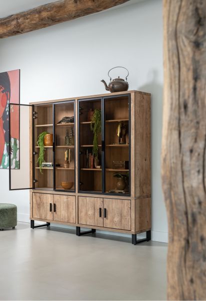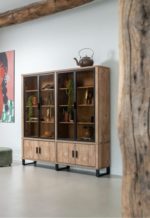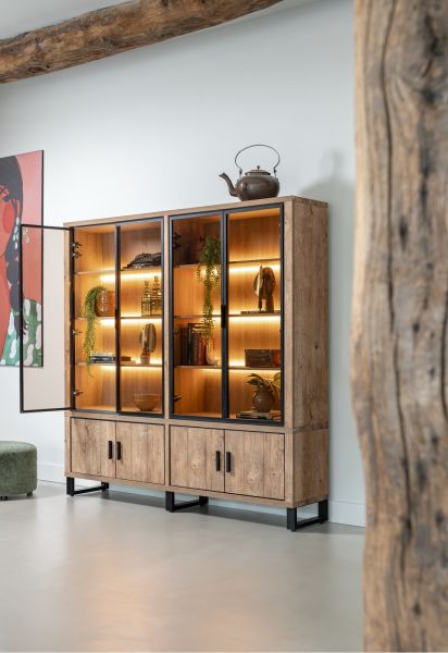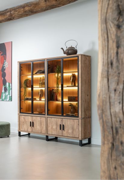 Deze buffetkast met vier deuren uit de collectie Pavarotti wordt verlicht door ingebouwde ledverlichting. Het meubel is vervaardigd uit Primo Laminato (HPL) in de kleur Barnwood met zwart metalen details. De kast is 210cm hoog, 210cm breed en past perfect in een landelijk, modern interieur. De glazen kast is ideaal om al je mooiste decoratie-objecten in uit te stallen. Maak van je woonkamer het centrale punt van je huis met deze robuuste buffetkast!