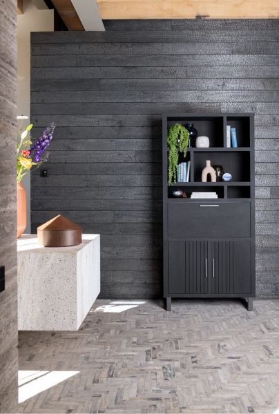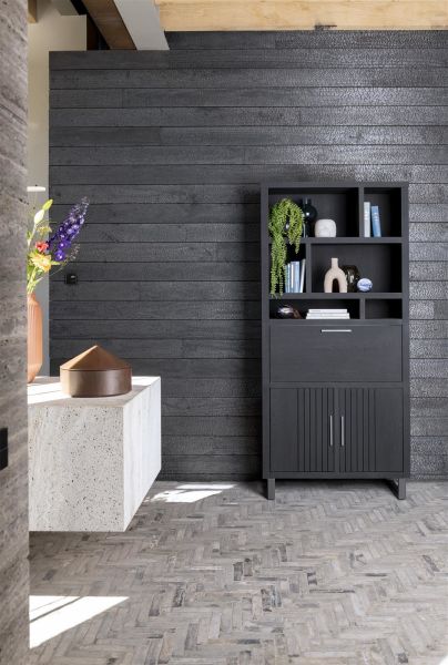 In de collectie Pavie van Henders & Hazel vind je 3 verschillende bergkasten met elk hun eigen karakteristieken. Dit is de middelgrote versie van 100cm breed die bestaat uit 2 ruime kastdeuren onderaan, een deur met klep die horizontaal opent in het midden en een bovenste gedeelte met wel 6 open vakken voor je decoratie. Deze kasten zijn zowel met als zonder zwart metalen poten verkrijgbaar. De kasten kunnen ook rechtstreeks op de plinten geplaatst worden voor een stoere, robuuste look. Ook zijn de kasten verkrijgbaar in 2 versies – Castle Black en in een natuurlijke houtkleur Natural. Deze versie is uitgevoerd in Castle Black.