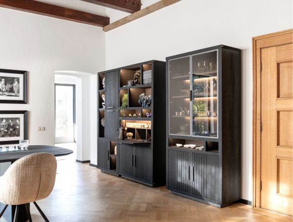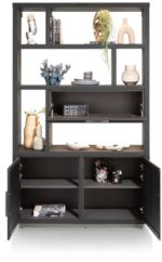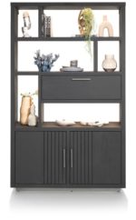 In de collectie Pavie van Henders & Hazel vind je 3 verschillende bergkasten met elk hun eigen karakteristieken. Dit is de grootste versie van 125cm breed die bestaat uit 2 ruime kastdeuren onderaan, een deur met klep die horizontaal opent in het midden en een bovenste gedeelte met wel 6 grote open vakken voor je decoratie. Deze kasten zijn zowel met als zonder zwart metalen poten verkrijgbaar. De kasten kunnen ook rechtstreeks op de plinten geplaatst worden voor een stoere, robuuste look. Ook zijn de kasten verkrijgbaar in 2 versies – Castle Black en in een natuurlijke houtkleur Natural. Deze versie is uitgevoerd in Castle Black.