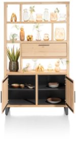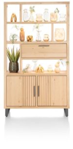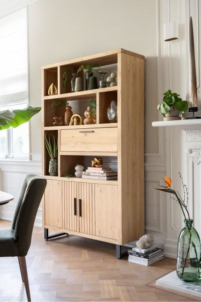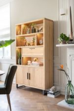 In de collectie Pavie van Henders & Hazel vind je 3 verschillende bergkasten met elk hun eigen karakteristieken. Dit is de grootste versie van 125cm breed die bestaat uit 2 ruime kastdeuren onderaan, een deur met klep die horizontaal opent in het midden en een bovenste gedeelte met wel 6 grote open vakken voor je decoratie. Deze kasten zijn zowel met als zonder zwart metalen poten verkrijgbaar. De kasten kunnen ook rechtstreeks op de plinten geplaatst worden voor een stoere, robuuste look. Ook zijn de kasten verkrijgbaar in 2 versies – Castle Black en in een natuurlijke houtkleur Natural. Deze versie is uitgevoerd in Natural.