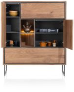De highboard uit de Trapani collectie biedt alle bergruimte die je nodig hebt: 2 deuren, 3 laden en een nis met led-verlichting. Dat maakt hem de perfecte kast voor fans van een sfeervol interieur met een industriële touch. Het smoked mangiferafineer heeft een heel warme tint, die prachtig contrasteert met de donker metalen omlijstingen en poten. De deuren en lades zijn allemaal voorzien van een push-to-open systeem, zodat de strakke lijnen van dit meubel niet worden onderbroken door handgrepen.