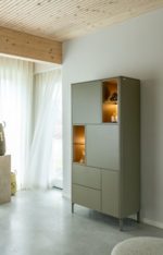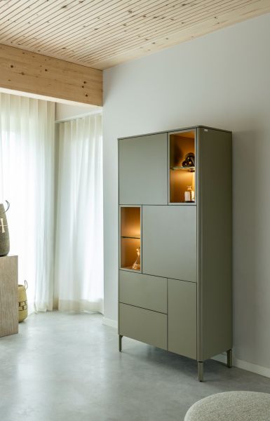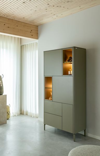 De olijfgroen uitvoering van deze bergkast van 95 cm uit de TRENTINO collectie geeft het meubel net wat meer karakter. De gelakte MDF-afwerking oogt modern en strak. Standaard wordt de kast geleverd met meekleurende metalen poten en een meekleurende plint. Optioneel zijn metalen poten in grafiet beschikbaar. De combinatie van drie deuren, twee laden en vier open niches met geïntegreerde ledverlichting maakt de kast veelzijdig. Ook verkrijgbaar in de kleur crème.