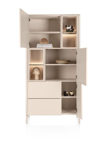 Deze bergkast uit de TRENTINO-collectie is compact en functioneel in gebruik. De kast is afgewerkt in gelakt MDF in de kleur crème, wat zorgt voor een rustige uitstraling. De kast wordt standaard geleverd met meekleurende metalen poten en een meekleurende plint. Aan jou de keuze hoe je hetdressoir plaatst. Metalen poten in de kleur grafiet zijn optioneel verkrijgbaar. Dankzij het push-to-open systeem zijn de deuren en laden greeploos uitgevoerd. Met drie deuren, twee laden en vier open niches met led-verlichting biedt de kast volop opbergruimte. Kies je voor de kleur crème of olijfgroen?
