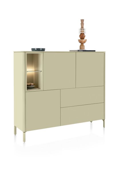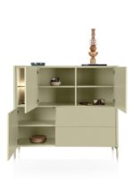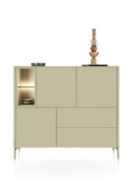 Deze dressette uit de TRENTINO collectie heeft een hoogte van 132 cm en combineert een overzichtelijke indeling met een rustige, moderne uitstraling. Het gelakte MDF in de kleur olijfgroen geeft het meubel een warme en eigentijdse look die mooi aansluit bij zowel lichte als natuurlijke interieurs. Standaard wordt de dressette geleverd met meekleurende metalen poten en een meekleurende plint, waarbij je zelf kunt bepalen welk onderstel het beste past. Optioneel zijn metalen poten in de kleur grafiet verkrijgbaar. Dankzij het push-to-open systeem zijn deuren en lades volledig greeploos uitgevoerd, wat zorgt voor een strak design. Met drie deuren, twee laden en twee open niches met geïntegreerde led-verlichting biedt dit dressette volop praktische opbergruimte. Het meubel is daarnaast ook verkrijgbaar in de kleur crème.
