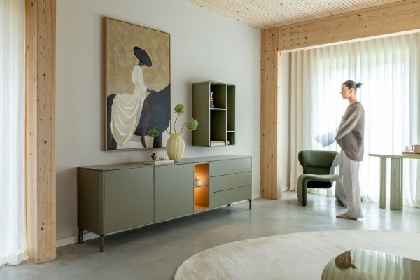 Het TRENTINO dressoir van 210 cm breed in de kleur olijfgroen heeft een warme en uitgesproken look. Door de afwerking in de gelakt MDF heeft het meubel een strakke uitstraling waardoor het goed aansluit bij een moderne inrichting. Standaard wordt het meubel geleverd met meekleurende metalen poten en een meekleurende plint. Optioneel zijn metalen poten in grafiet mogelijk. De indeling met twee deuren, drie laden en twee open niches met geïntegreerde led-verlichting maakt het dressoir praktisch in gebruik. Het dressoir is ook verkrijgbaar in de kleur crème.