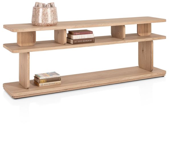 De Scandinavische woonstijl is razend populair en met de collectie Azulo & Azulaar, hebben we bij Henders & Hazel een perfect voorbeeld ervan, waarin je alle belangrijke kenmerken van deze woonstijl terugziet. De meubels zijn gemaakt van naturel eikenfineer met een lichte laklaag, terwijl alle tafelbladen van massief eikenhout zijn. De belijning is zo puur als hij maar zijn kan: zonder toevoeging van andere materialen, lijsten of handgrepen. De deuren en lades zijn fraai afgeschuind en standaard voorzien van een soft-closing systeem.Onder de naam Azulaar vind je drie open kasten in de collectie, van respectievelijk 60, 120 en 190 cm hoogte. Alle drie de kasten kun je tegen een muur plaatsen of los in de ruimte, zodat je ze ook kunt gebruiken als sidetable of roomdivider. Dit is de versie die 55 cm hoog is. Ze is 165 cm breed en 35 cm diep.