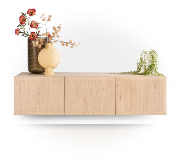 De Scandinavische woonstijl wordt steeds geliefder, ook bij Henders & Hazel. Onze Azulo-collectie belichaamt alle kenmerkende elementen van deze stijl. De meubels zijn vervaardigd uit natuurlijk eikenfineer met een subtiele laklaag, terwijl de tafelbladen van massief eikenhout zijn. Het design is minimalistisch en puur, zonder overbodige details zoals lijsten, handgrepen of extra materialen. De elegant afgeschuinde deuren en lades zijn standaard voorzien van een soft-closing systeem voor extra gebruiksgemak. Bovendien bieden de lowboards veelzijdigheid: ze kunnen zowel staand geplaatst als zwevend gemonteerd worden. De bijgeleverde bevestigingslat maakt ophangen op elk moment eenvoudig. Dit model, met drie deuren, heeft een breedte van 160 cm, een diepte van 42 cm en een hoogte van 60 cm.