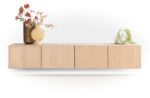 Geen wonder dat de Scandinavische woonstijl populairder is dan ooit, ook bij Henders & Hazel. In onze collectie Azulo zie je alle belangrijke kenmerken van deze woonstijl terug. De meubels zijn gemaakt van naturel eikenfineer met een lichte laklaag, terwijl alle tafelbladen van massief eikenhout zijn. De belijning is zo puur als hij maar zijn kan: zonder toevoeging van andere materialen, lijsten of handgrepen. De deuren en lades zijn fraai afgeschuind en standaard voorzien van een soft-closing systeem De lowboards hebben bovendien de handigheid dat je neer kunt zetten óf op kunt hangen. De bevestigingslat die daarvoor nodig is wordt standaard meegeleverd, dus ophangen kan op elk moment. Dit is de versie met vier deurtjes – 230 cm breed, 42 cm diep en 60 cm hoog.