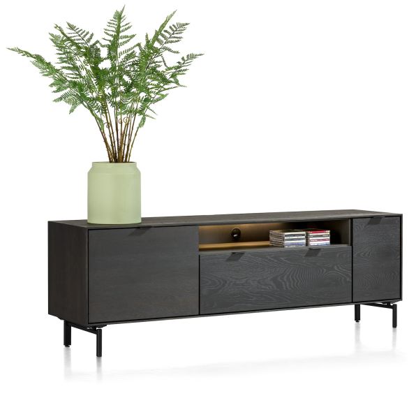Een moderne lage dressoirkast met een natuurlijke, eigentijdse look; dat is lowboard ELEMENTS! De buitenkant is vervaardigd van eikenfineer in de kleur onyx en de binnenkant is gemaakt van melamine in de kleur antraciet. ELEMENTS heeft 1-deur + 1-lade + klep + 1-niche dat met led is verlicht. Het lowboard heeft een afmeting van 180 cm en is er ook in de kleur naturel. Hang je hem aan de muur of plaats je hem op de metalen poten die zijn meegeleverd? Ontdek ook alle andere kasten uit de ELEMENTS serie.