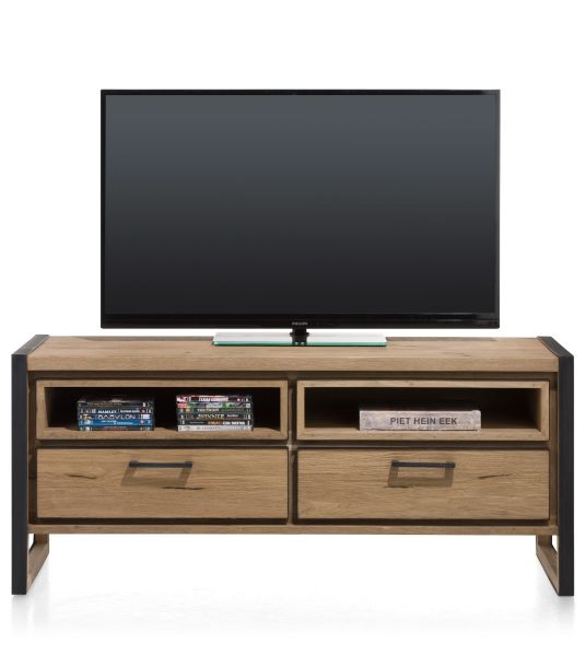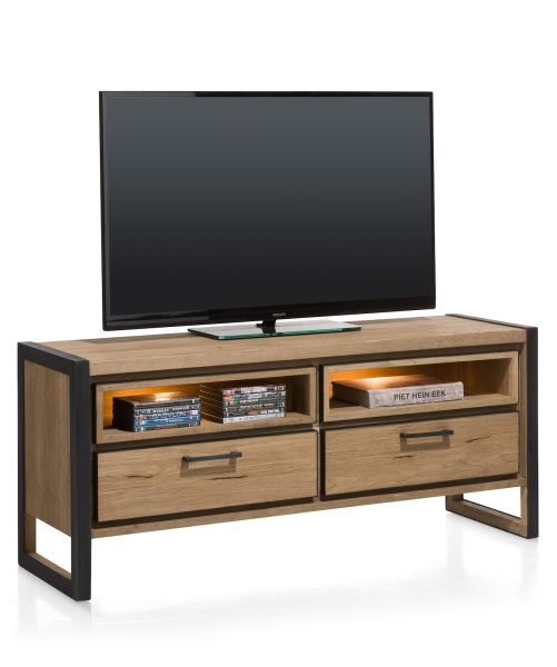 Dit moderne lowboard uit de Metalo collectie van Henders & Hazel heeft een stoere eigentijdse uitstraling door de combinatie van metaal en eikenhout fineer. De metalen omlijsting rondom de 2 niches en 2 laden en de metalen poten zorgen voor een robuuste look. De geïntegreerde led-verlichting is niet alleen handig, maar ook sfeervol. De laden sluiten zacht dankzij het soft closing systeem. Een fijn tv-meubel en een musthave in het interieur.