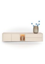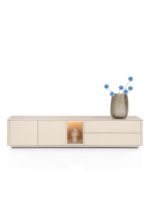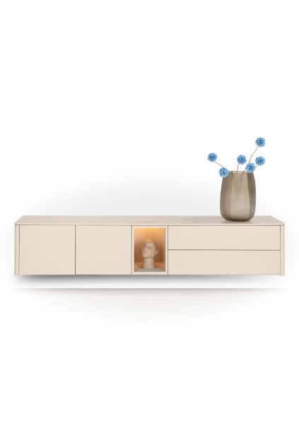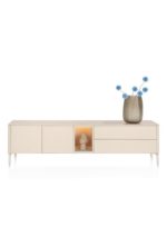 Dit TRENTINO lowboard van 210 cm is uitgevoerd gelakt MDF in de kleur crème en past perfect in een licht en eigentijds interieur. Het minimalistische ontwerp zonder grepen is voorzien van een push-to-open systeem voor optimaal gebruiksgemak. Dankzij 2 deuren, 2 laden en een verlichte niche biedt het meubel veel praktische opbergruimte. De meekleurende plint wordt standaard meegeleverd, evenals het meekleurende metalen onderstel. Optioneel is een grafietkleurig onderstel verkrijgbaar. Ook wandmontage is mogelijk. Dit lowboard is ook verkrijgbaar in de kleur olijfgroen. Dit lowboard is ook verkrijgbaar in de kleur olijfgroen.
