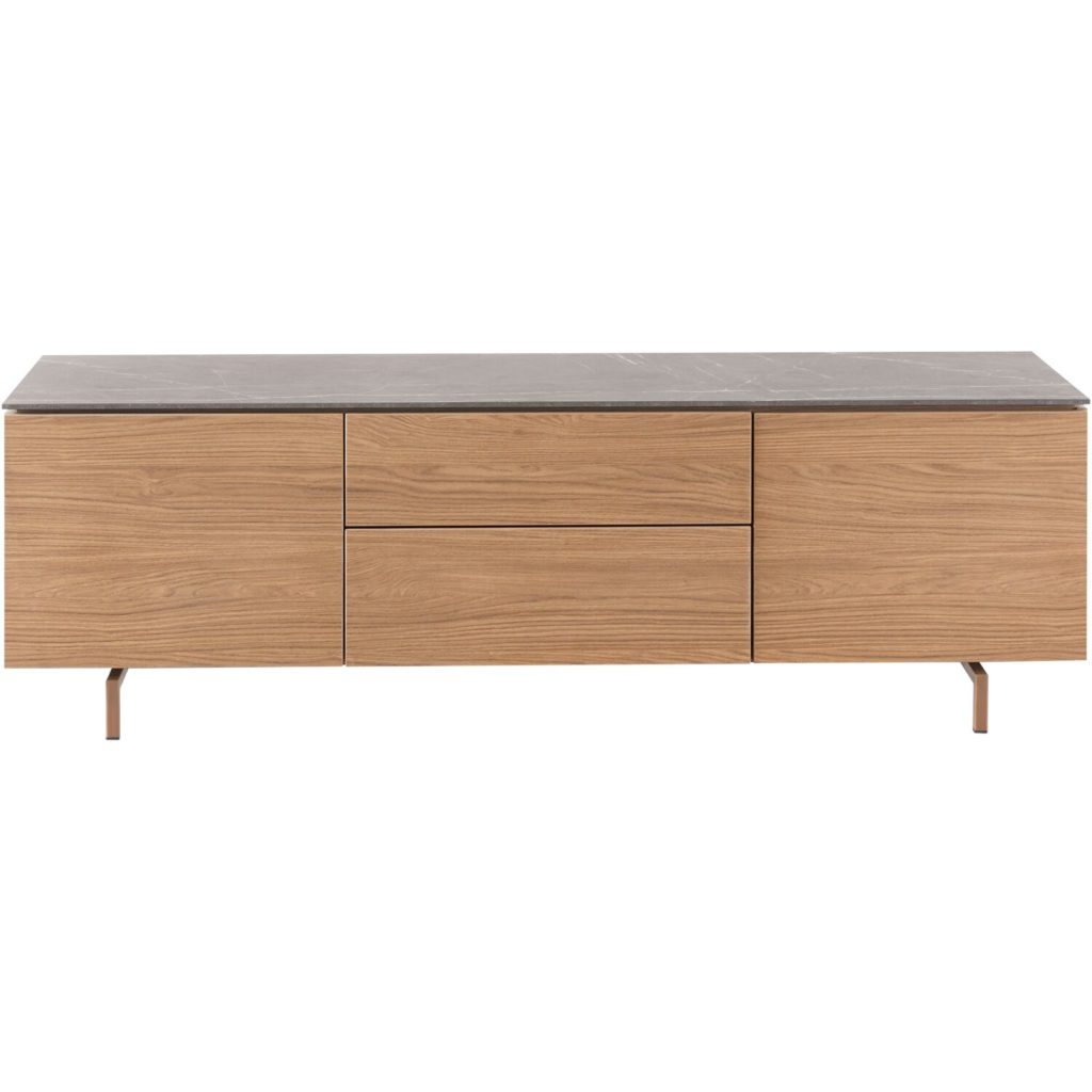 TV-meubel Stonara small is onderdeel van een woonprogramma en heeft een strakke en moderne uitstraling. Door de ranke pootjes lijkt het TV-meubel te zweven. Het TV-meubel is gemaakt van onderhoudsvriendelijke Lamulux en heeft een warme houtstructuur. De bovenbladen zijn uitgevoerd in een stijlvol marmerdecor.