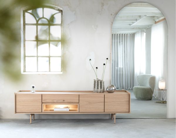 Een strak vormgegeven lowboard met een natuurlijke uitstraling; dat is lowboard VALGARD van XOOON. Het lowboard van naturelkleur eikenfineer heeft een onderstel in naturelkleur hout. Het is 160 cm breed en voorzien van 3-deuren + 1-lade + 1-niche met ledverlichting. De greeploze deuren en lade met soft close systeem geven VALGARD zijn strakke, minimalistische look. Vergeet vooral niet te kijken naar de andere mooie kasten uit deze serie. VALGARD laat zich prachtig combineren met bijpassende tafelcollecties: COSENZA en PALMA.