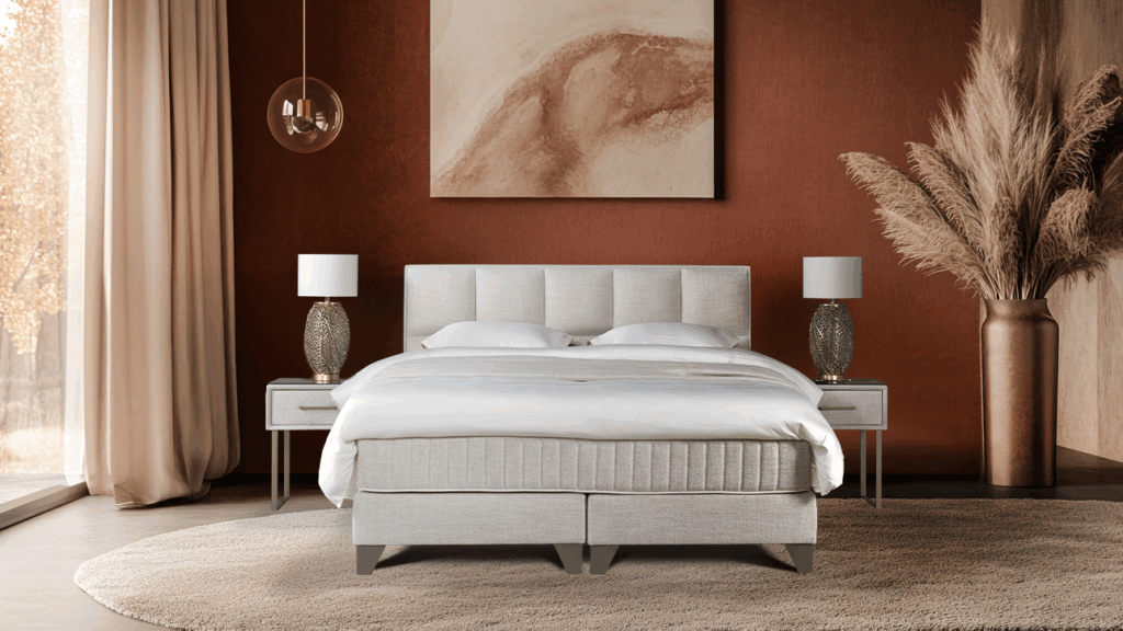 De Serta Hollywood boxspring heeft een vierkante vlakverdeling, wat zorgt voor een strakke en moderne uitstraling. Hij is bekleed met een luxe lichte stof die stijlvol oogt en in elk interieur past.