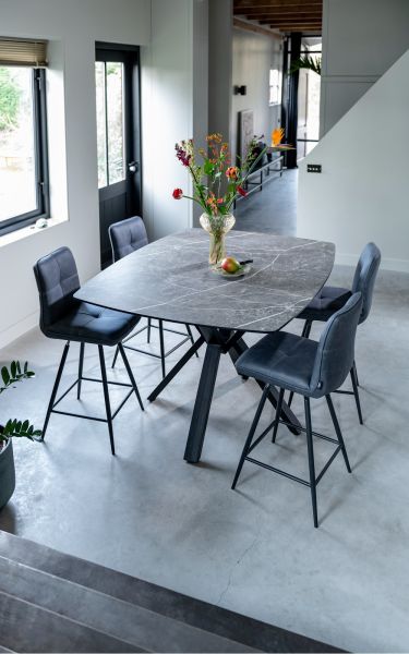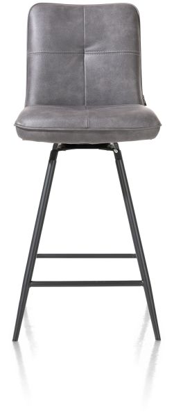 Deze moderne barstoel Milva is bekleed met de stof Pala in de kleur antraciet. De barstoel staat op een stoer zwart metalen frame. Heel handig is het draaisysteem, waardoor je eenvoudig de stoel opzij draait. Zo kan je makkelijk van de kruk stappen.