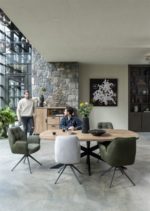 Deze eetkamerstoel Bell heeft een uniek design met ruitvormige inpullingen in de rug en een speciaal zitcomfort met pocketvering. Het fijne frame heeft een grafietkleur en is bovendien draaibaar. De achterkant van deze stoelenserie is bekleed in de microvezelstof Calabria, de voorkant in stof Vada. Er is echter ook een versie die enkel in stof Calabria is uitgevoerd. De stoel is verkrijgbaar in 3 verschillende kleuren – kiezel, mosgroen en olijfkleurig. Dit is de uitvoering in olijf. Ben je eerder fan van een armstoel? Die vind je ook in deze collectie!