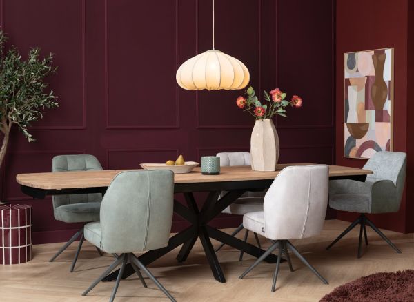 Deze eetkamerstoel Bell heeft een uniek design met ruitvormige inpullingen in de rug en een speciaal zitcomfort met pocketvering. Het fijne frame heeft een grafietkleur en is bovendien draaibaar. Deze stoelen zijn bekleed in de fijne microvezelstof Calabria. Er is echter ook een versie die in een combinatie van stof Calabria en stof Vada is uitgevoerd! De stoel is verkrijgbaar in 3 verschillende kleuren – kiezel, mosgroen en olijfkleurig. Dit is de uitvoering in olijf. Ben je eerder fan van een armstoel? Die vind je ook in deze collectie!