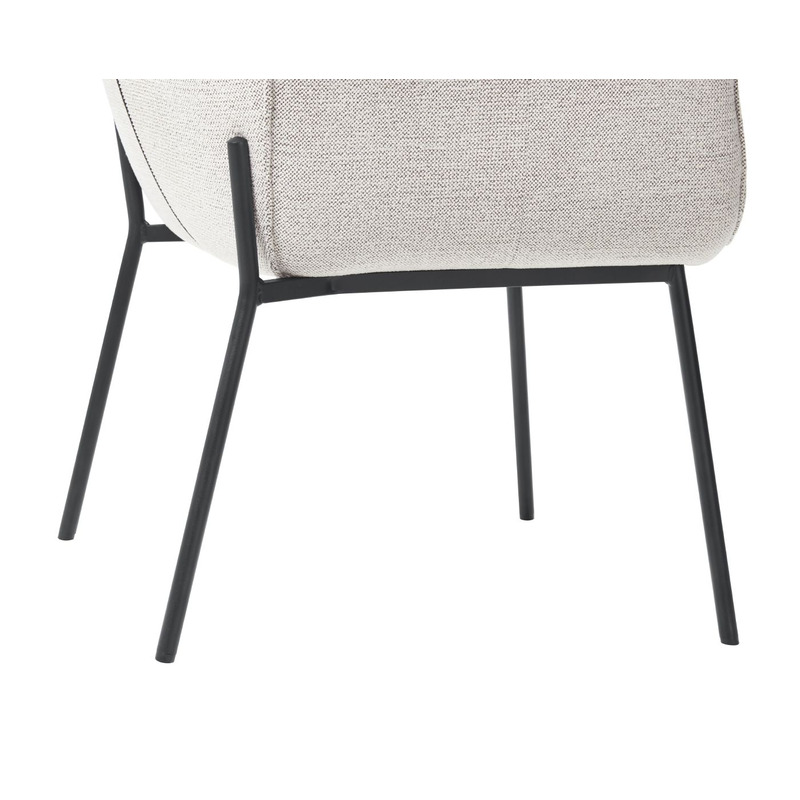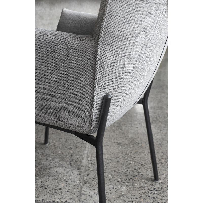 Deze uitvoering van de armstoel is bekleed in stof sneak, dit is een grove weefstof met een zachte touch. Daarnaast is de stoel voorzien van een zwart metalen frame, waarbij het frame iets doorloopt naar boven aan de achterkant van de rugleuning.