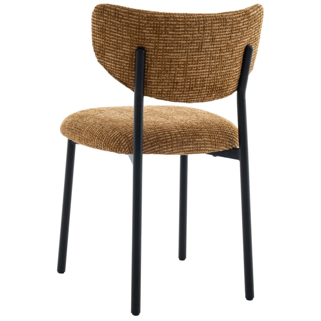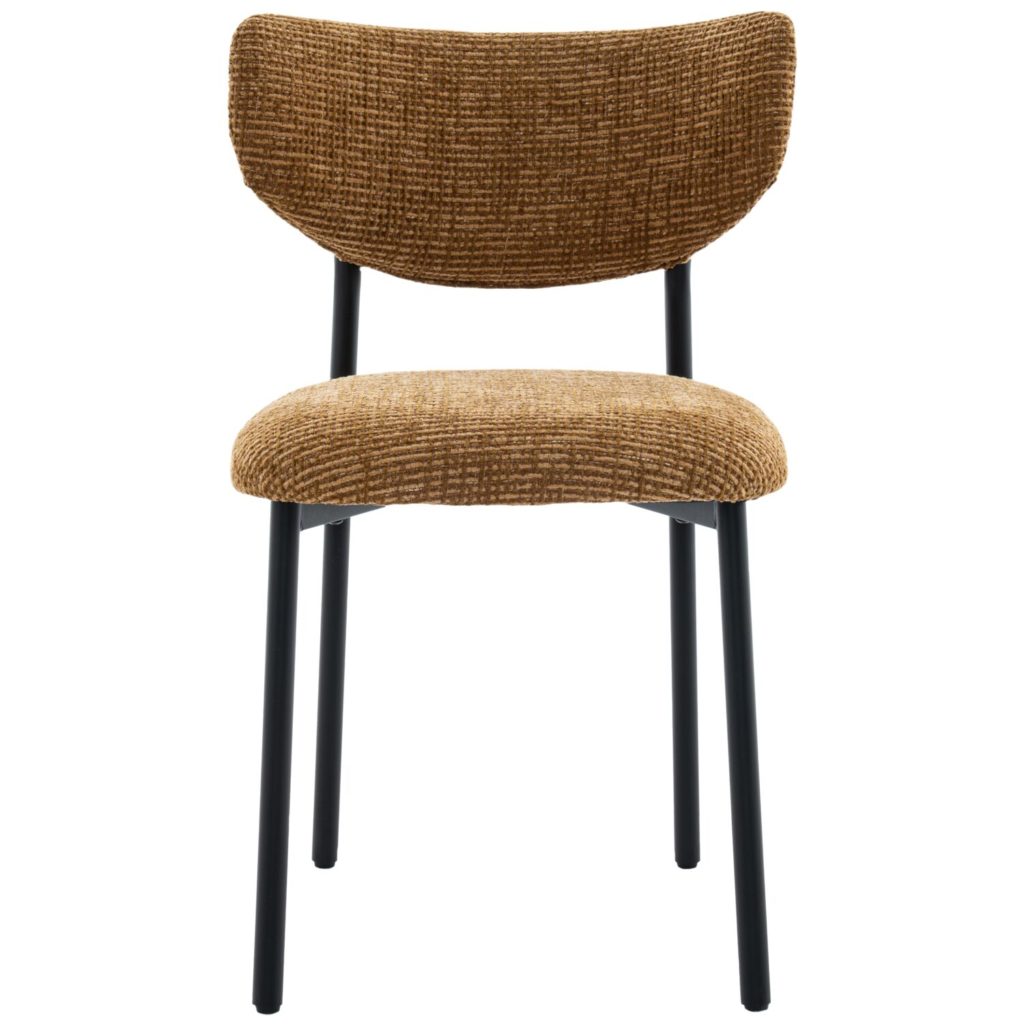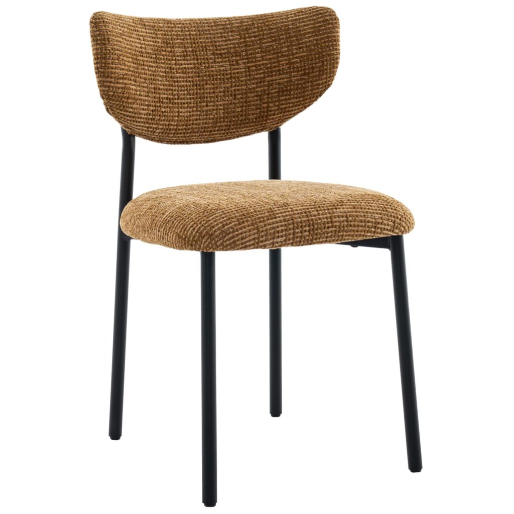 Eetkamerstoel Emala heeft een trendy uiterlijk en zit ook nog eens heerlijk comfortabel. Deze leuke eetkamerstoel is uitgevoerd in een prachtige cognac kleurige grof geweven stof en zwarte metalen poten.