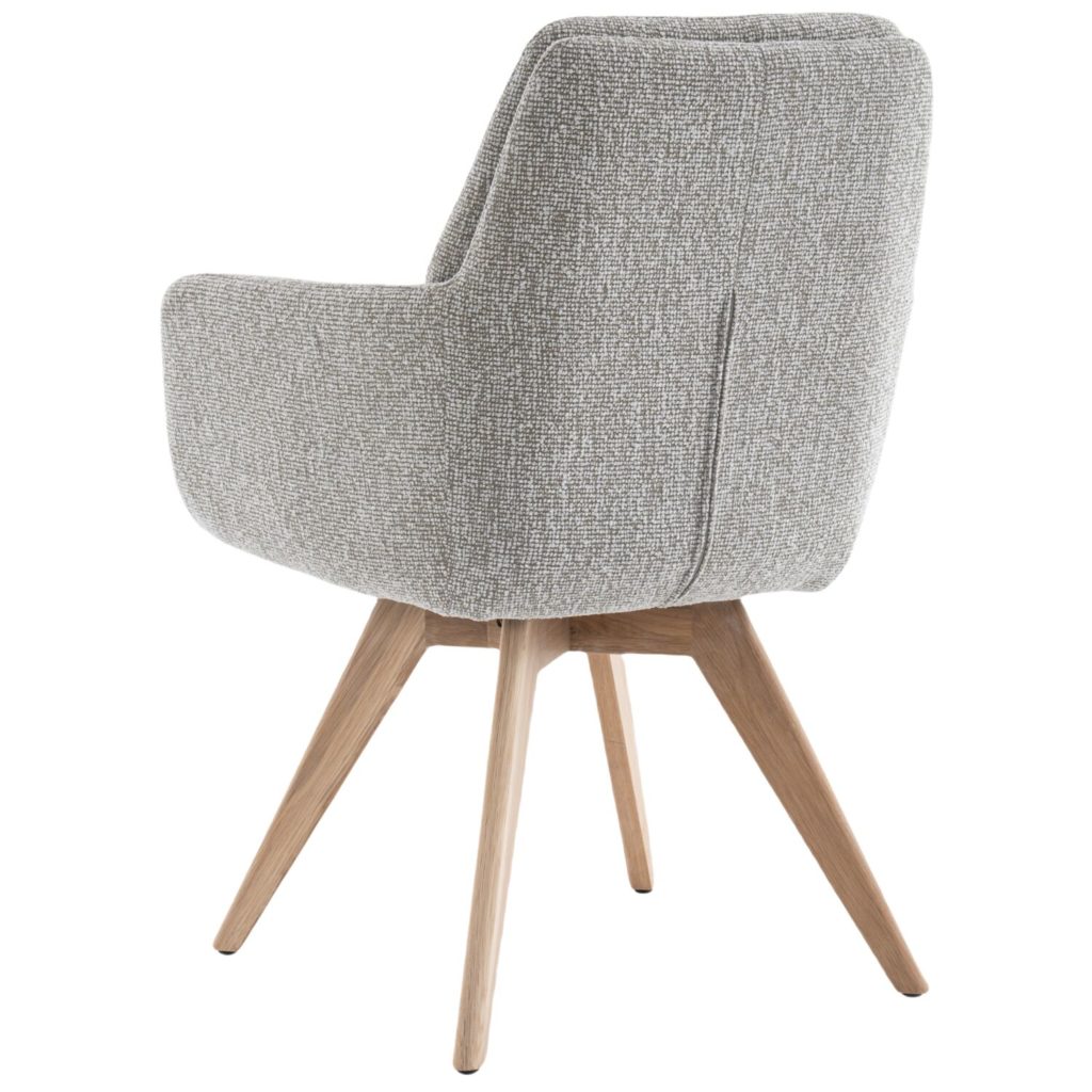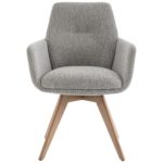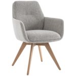 Armstoel Jasmia is met zijn moderne uiterlijk een echte parel voor in je eetkamer. Deze tijdloze eetkamerstoel is uitgevoerd in een prachtige taupe kleurige bouclé stof en een draaibaar massief eiken onderstel inclusief terugdraaimechanisme. Hierdoor zal de stoel altijd weer naar zijn oorspronkelijke positie terugdraaien.